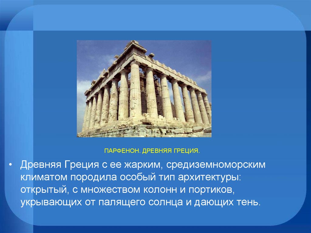 ПАРФЕНОН. ДРЕВНЯЯ ГРЕЦИЯ.• Древняя Греция с ее жарким, средиземноморским