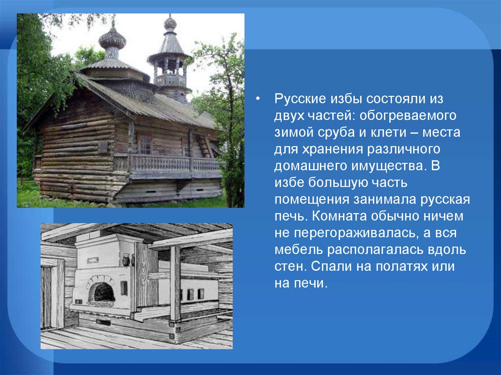 • Русские избы состояли издвух частей: обогреваемого