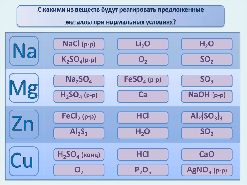 С какими из веществ будут реагировать предложенныеметаллы при нормальных условиях?