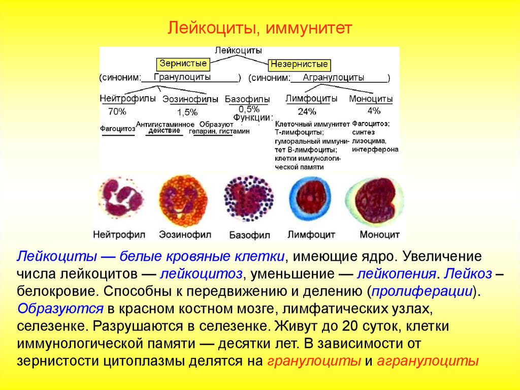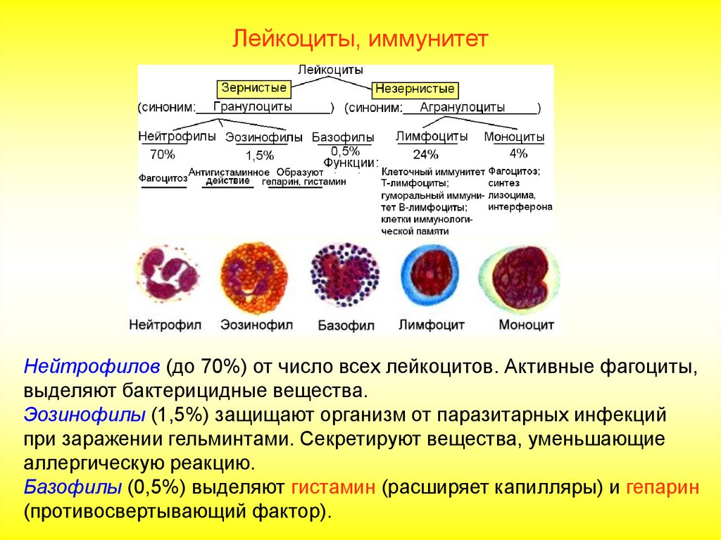 Лейкоциты, иммунитетНейтрофилов (до 70%) от число всех лейкоцитов. Активные фагоциты,