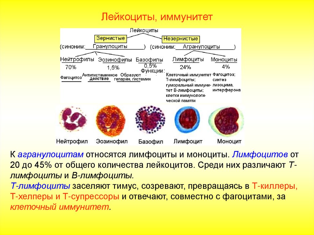 Лейкоциты, иммунитетК агранулоцитам относятся лимфоциты и моноциты. Лимфоцитов от