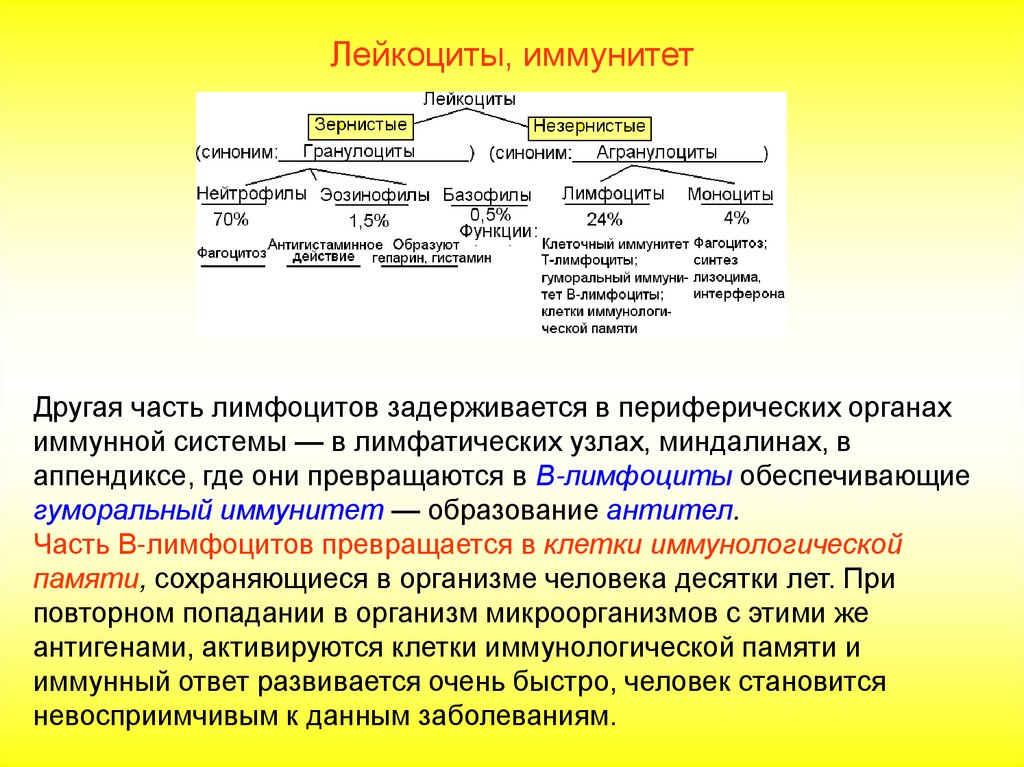 Лейкоциты, иммунитетДругая часть лимфоцитов задерживается в периферических органах