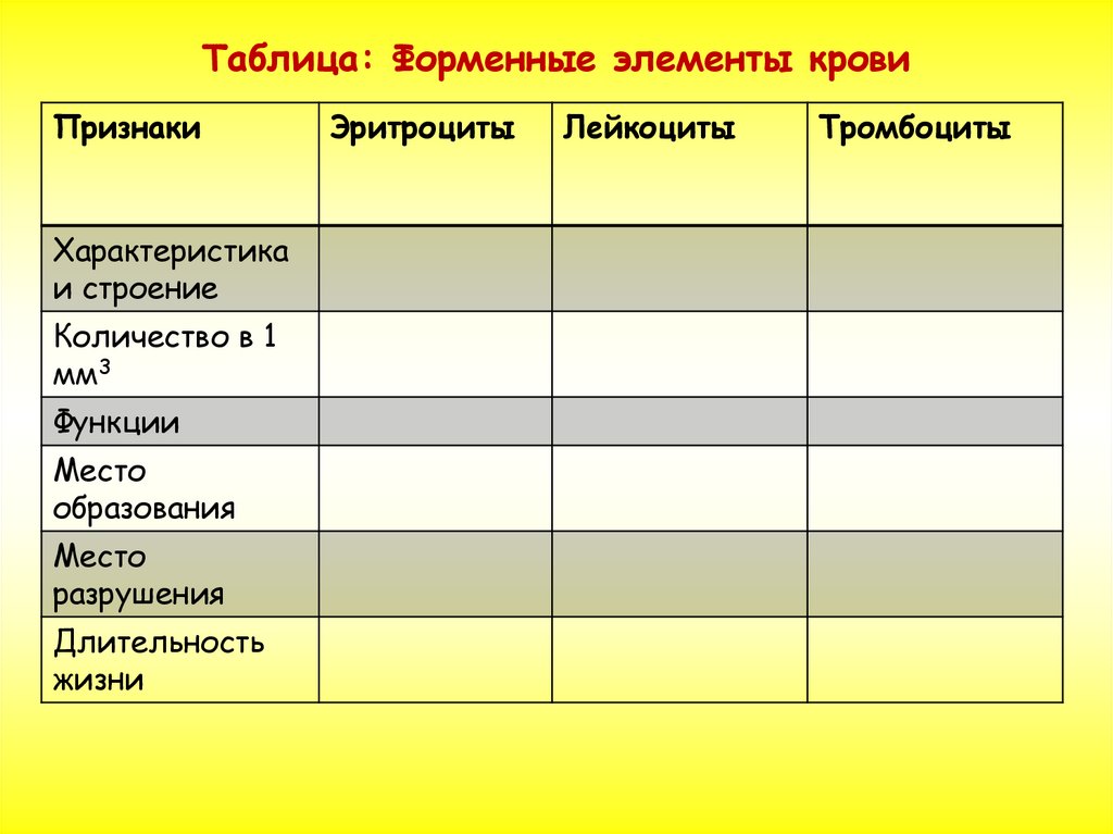 Таблица: Форменные элементы кровиПризнаки