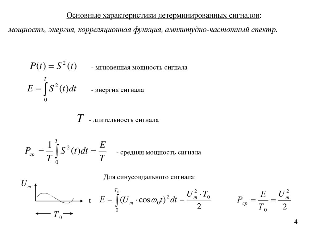 Основные характеристики детерминированных сигналов:мощность, энергия, корреляционная функция, амплитудно-частотный спектр.