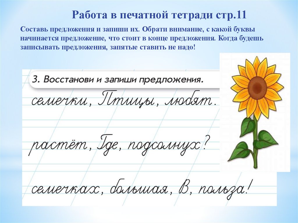 Работа в печатной тетради стр.11Составь предложения и запиши их. Обрати внимание, с какой буквы
