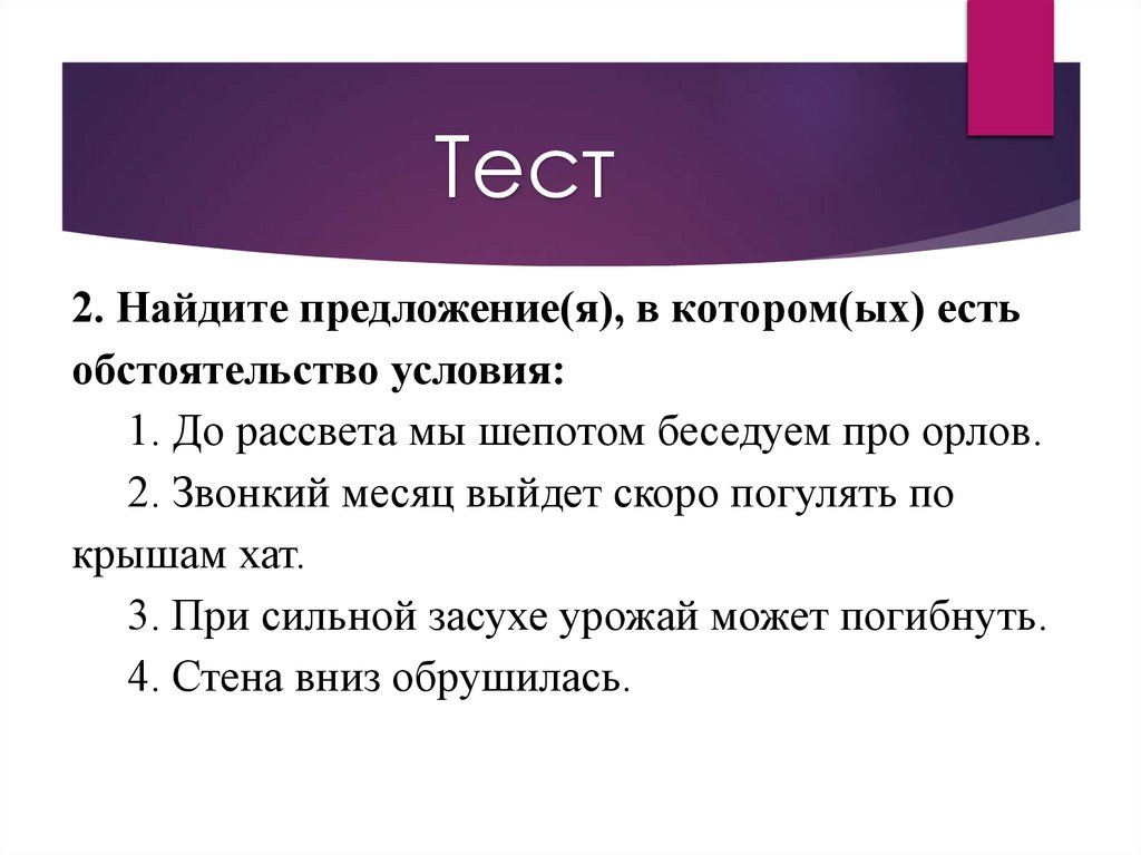 Тест-пятиминутка1. Какой второстепенный член предложения обозначает, при каких обстоятельствах и