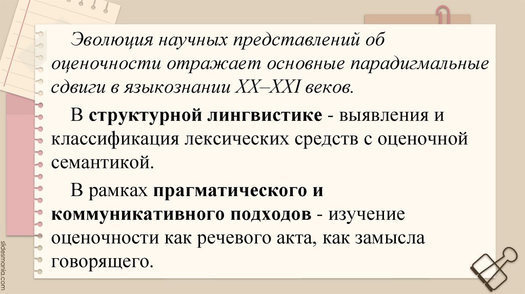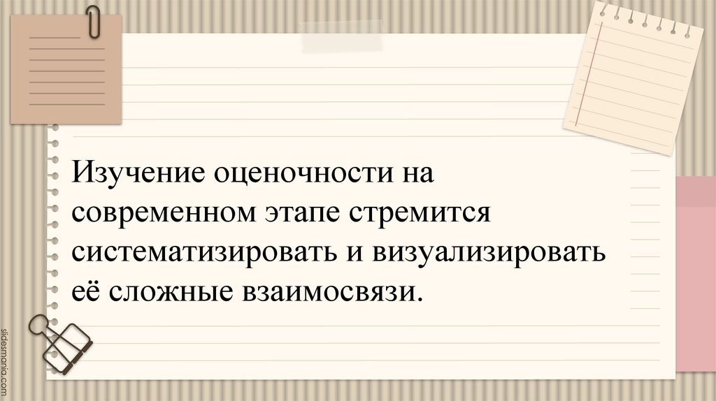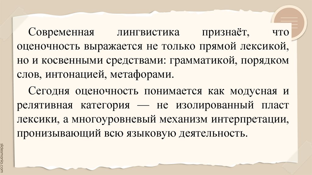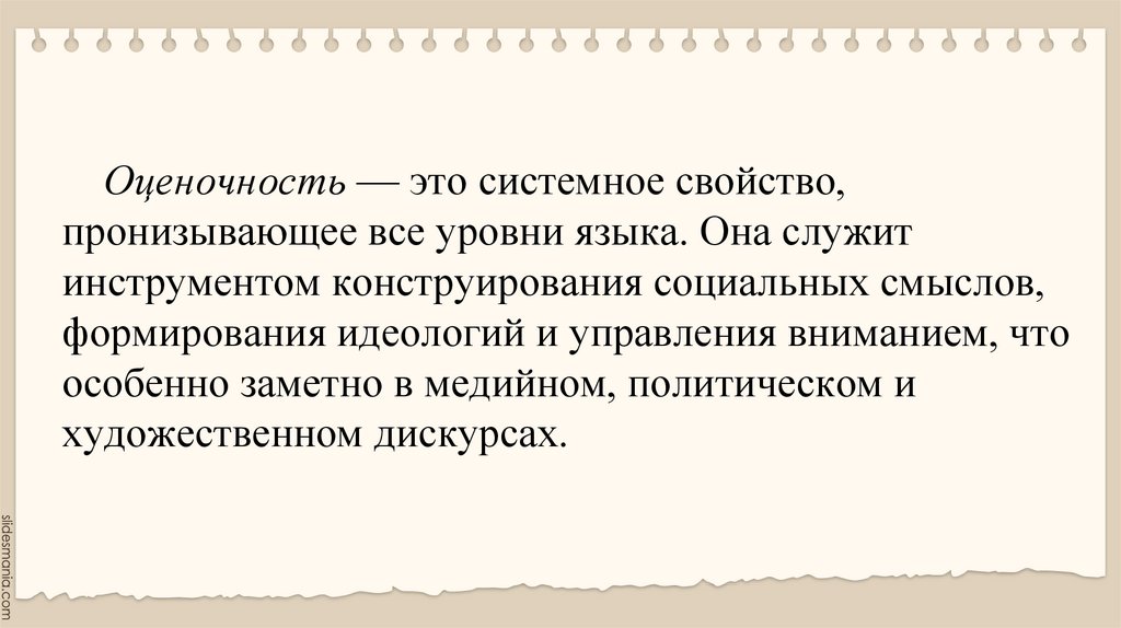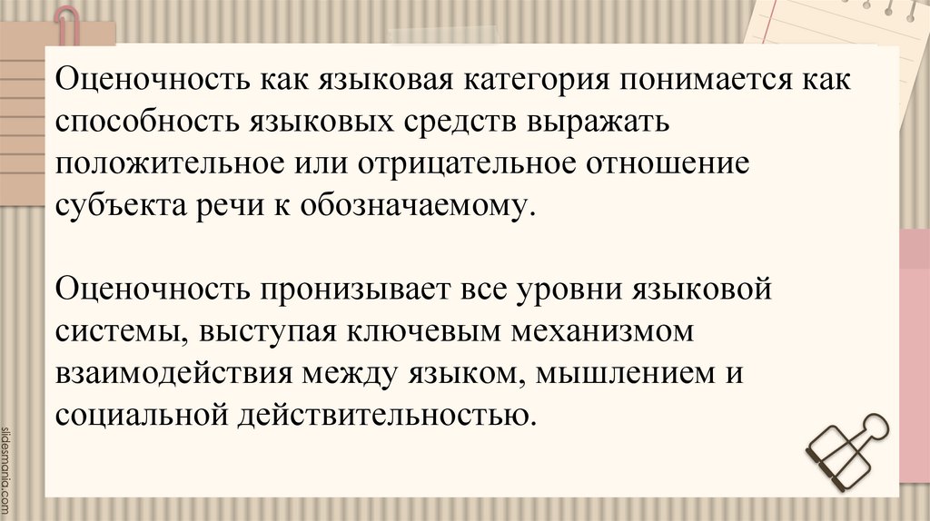 Оценочность — это системное свойство,пронизывающее все уровни языка. Она служит