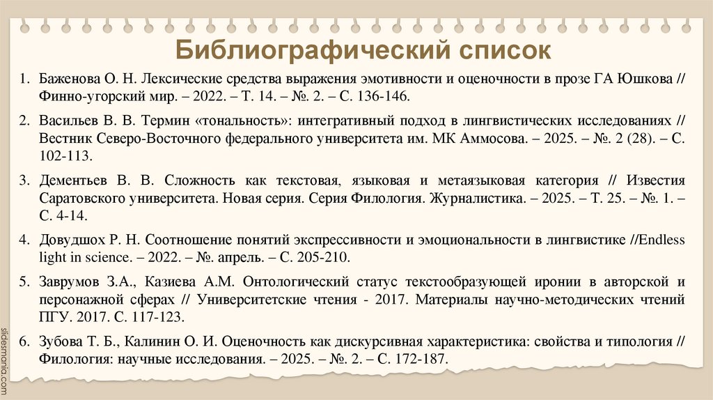 Библиографический список1. Баженова О. Н. Лексические средства выражения эмотивности и оценочности в прозе ГА Юшкова //