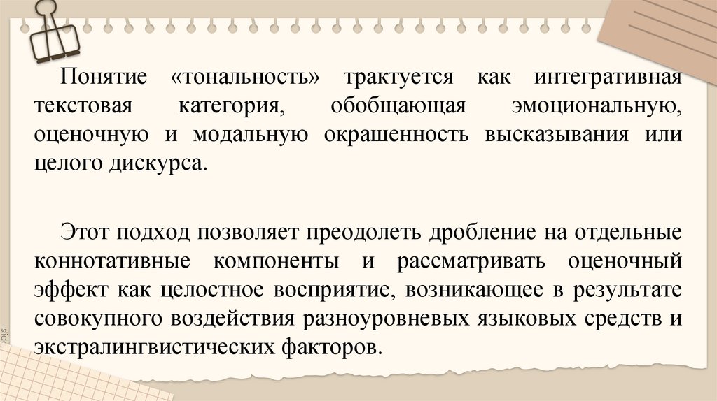 Понятие «тональность» трактуется как интегративнаятекстовая