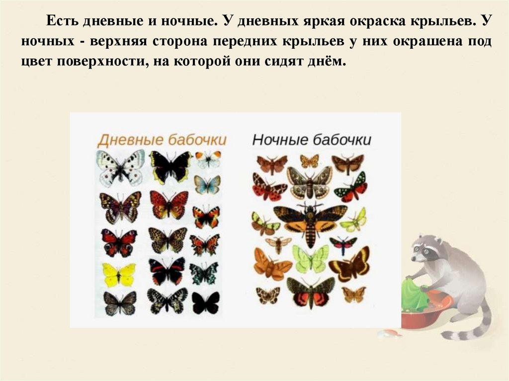 Есть дневные и ночные. У дневных яркая окраска крыльев. Уночных - верхняя сторона передних крыльев у них окрашена под