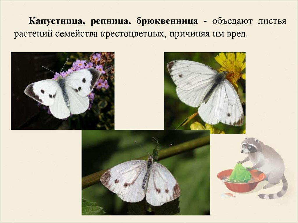 Капустница, репница, брюквенница - объедают листьярастений семейства крестоцветных, причиняя им вред.