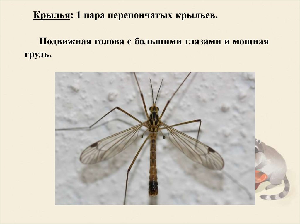 Крылья: 1 пара перепончатых крыльев.Подвижная голова с большими глазами и мощная