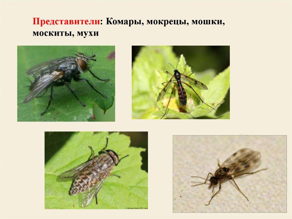 Представители: Комары, мокрецы, мошки,москиты, мухи