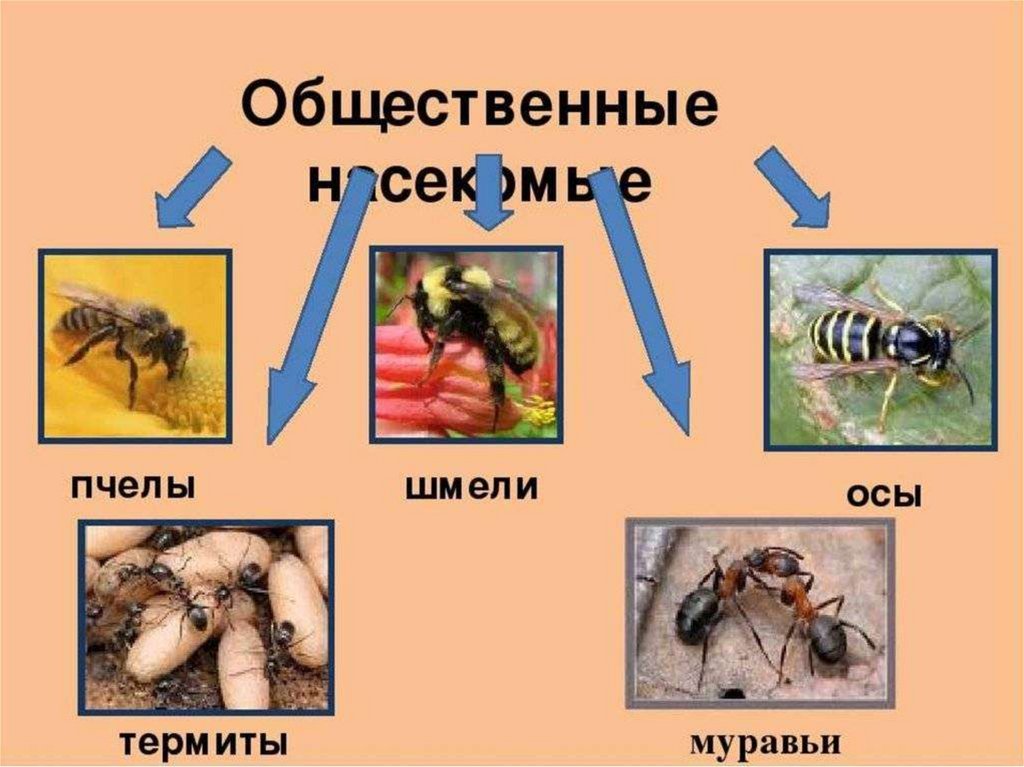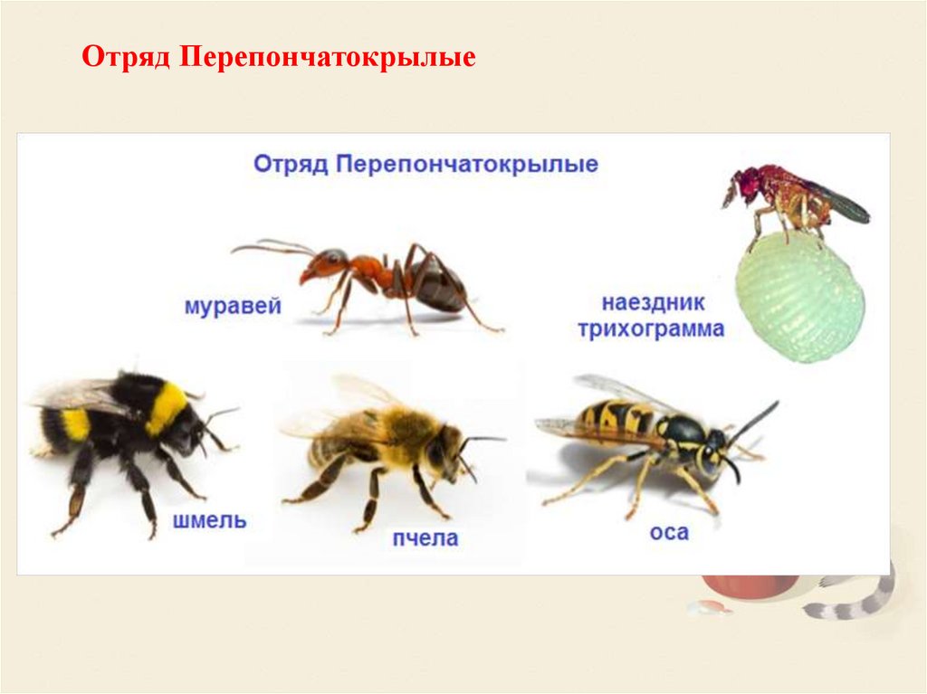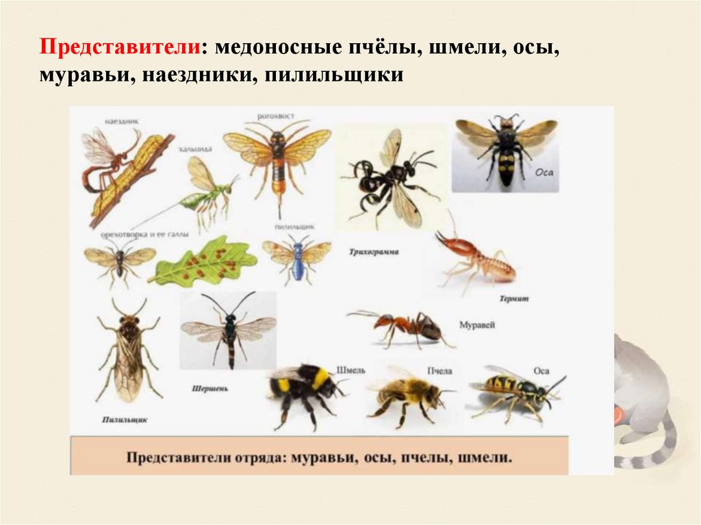 Представители: медоносные пчёлы, шмели, осы,муравьи, наездники, пилильщики
