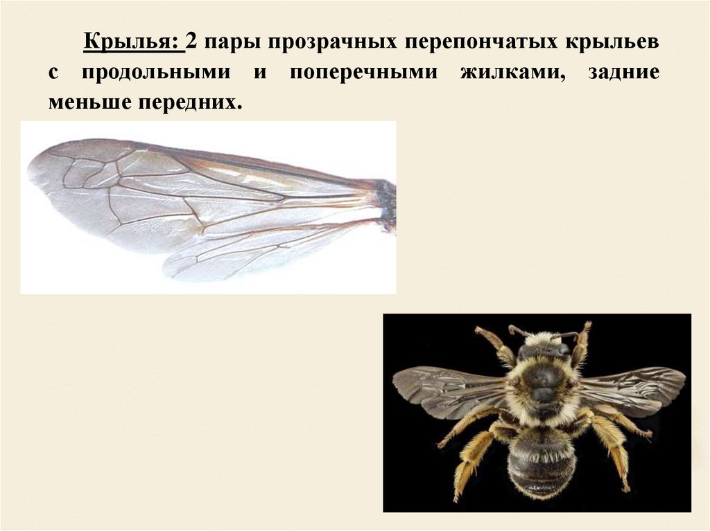 Крылья: 2 пары прозрачных перепончатых крыльевс продольными и поперечными жилками, задние