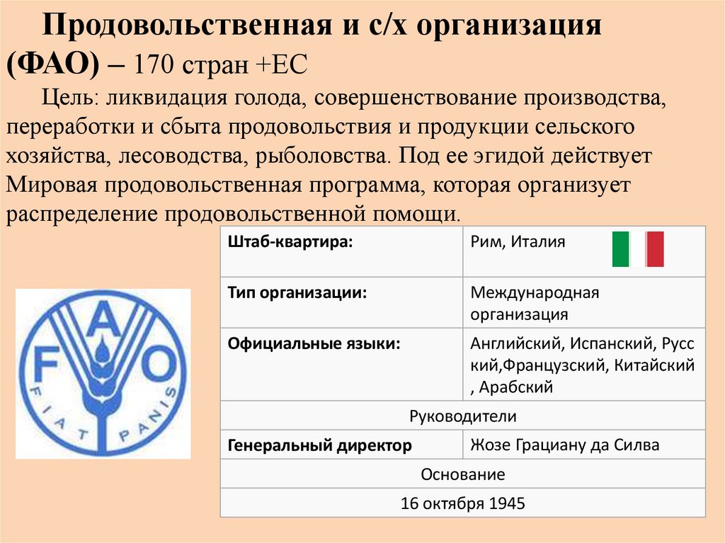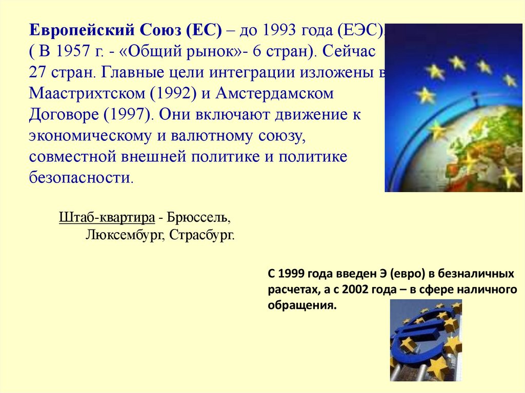 Европейский Союз (ЕС) – до 1993 года (ЕЭС).( В 1957 г. - «Общий рынок»- 6 стран). Сейчас