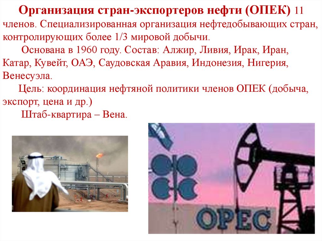 Организация стран-экспортеров нефти (ОПЕК) 11членов. Специализированная организация нефтедобывающих стран,