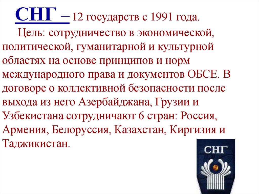 СНГ – 12 государств с 1991 года.Цель: сотрудничество в экономической,