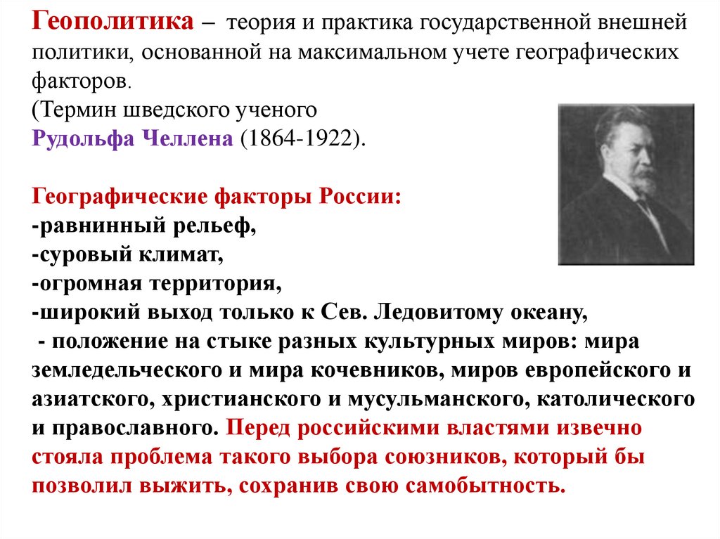 Геополитика – теория и практика государственной внешнейполитики, основанной на максимальном учете географических