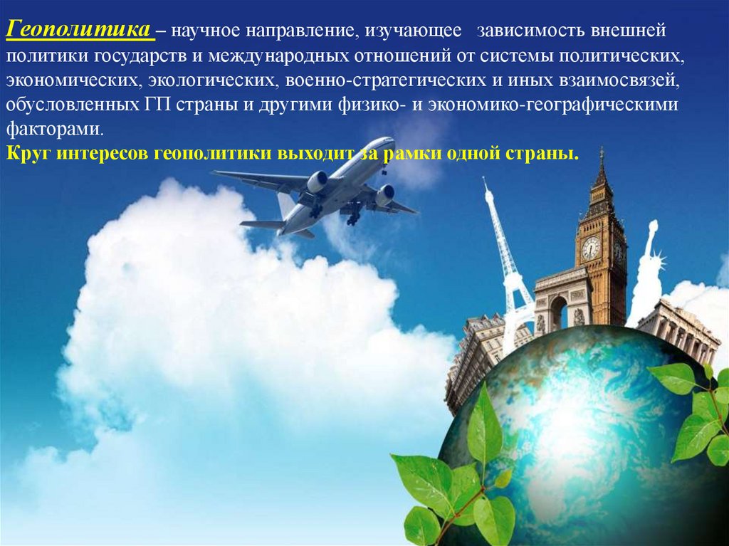Геополитика – научное направление, изучающее зависимость внешнейполитики государств и международных отношений от системы политических,