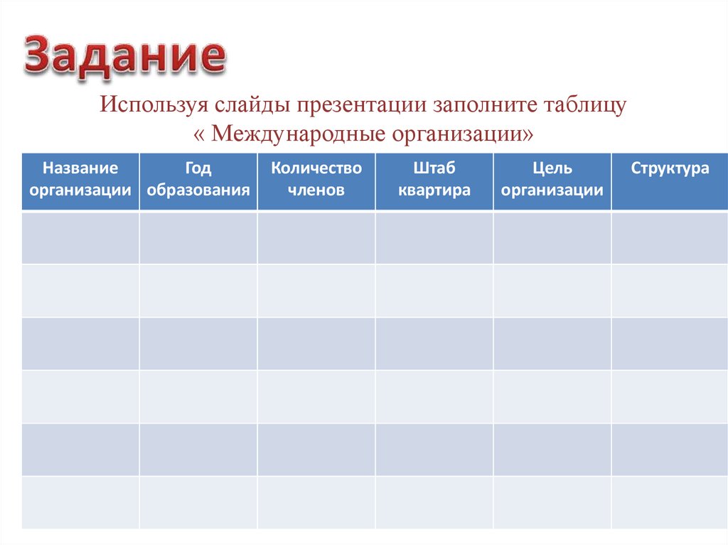 Используя слайды презентации заполните таблицу« Международные организации»