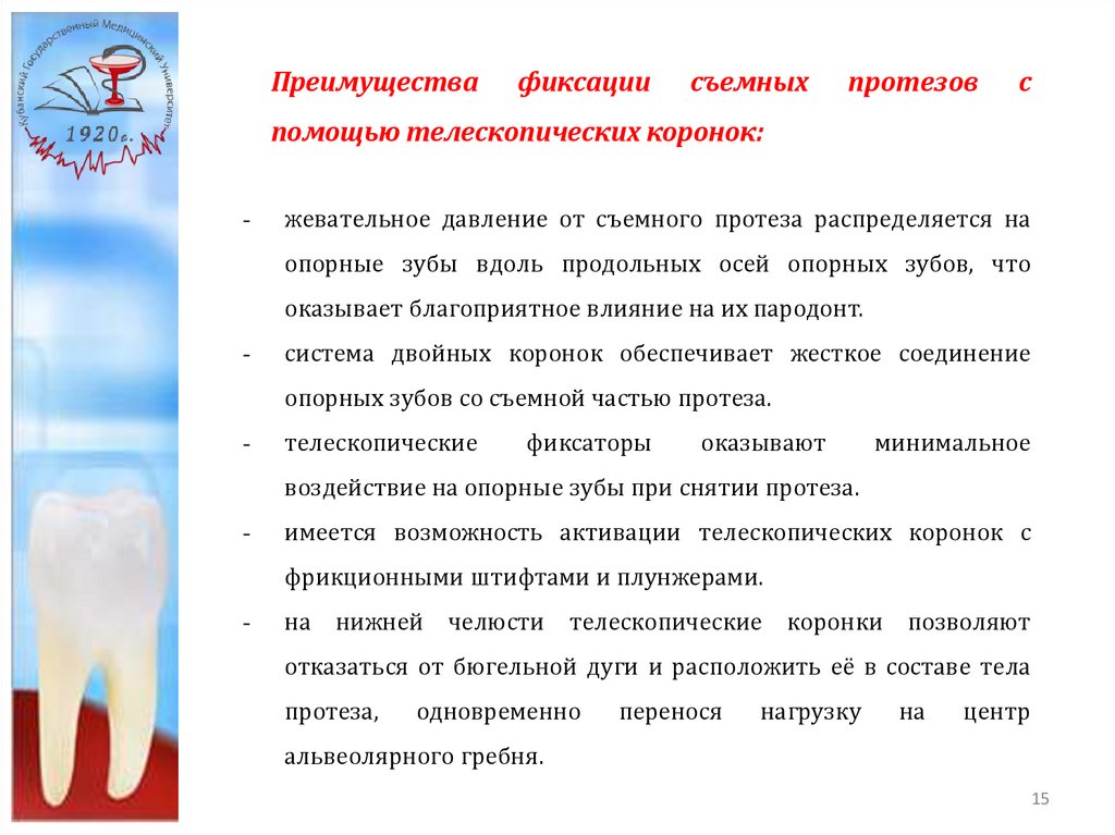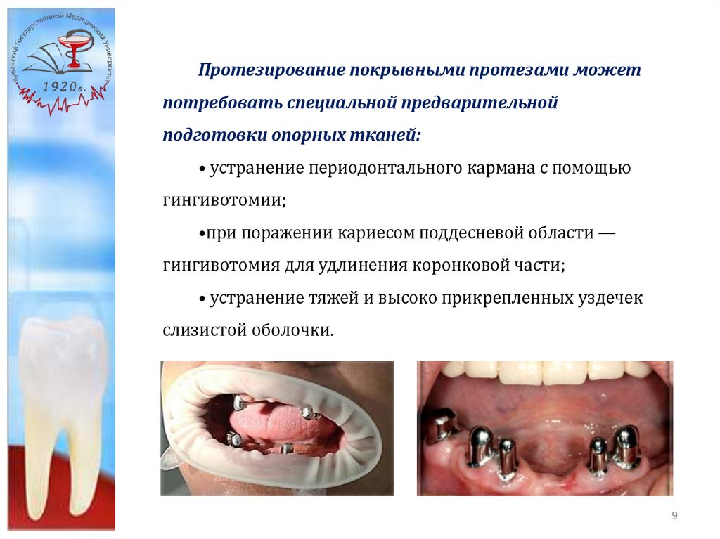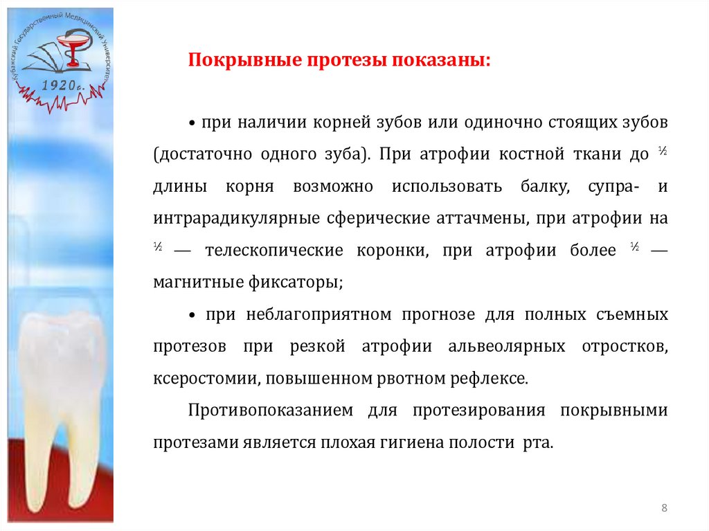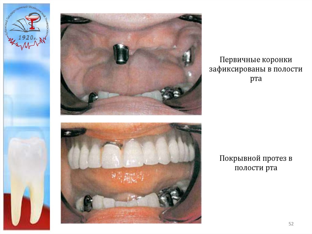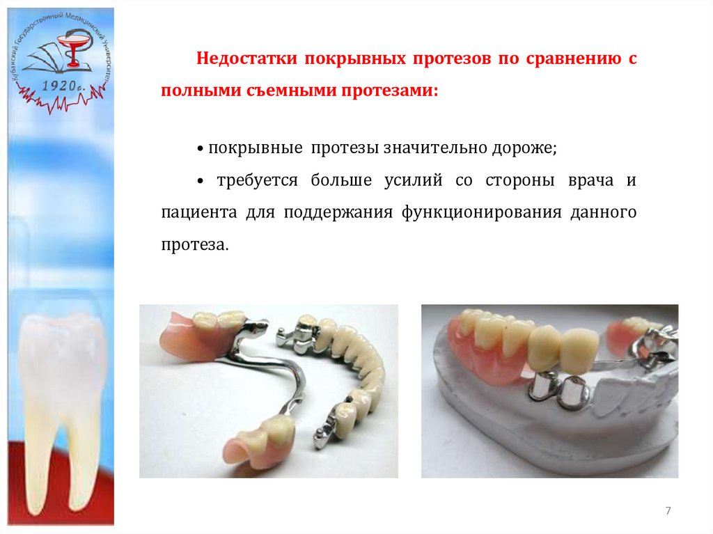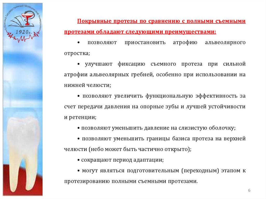 Покрывные протезы по сравнению с полными съемнымипротезами обладают следующими преимуществами: