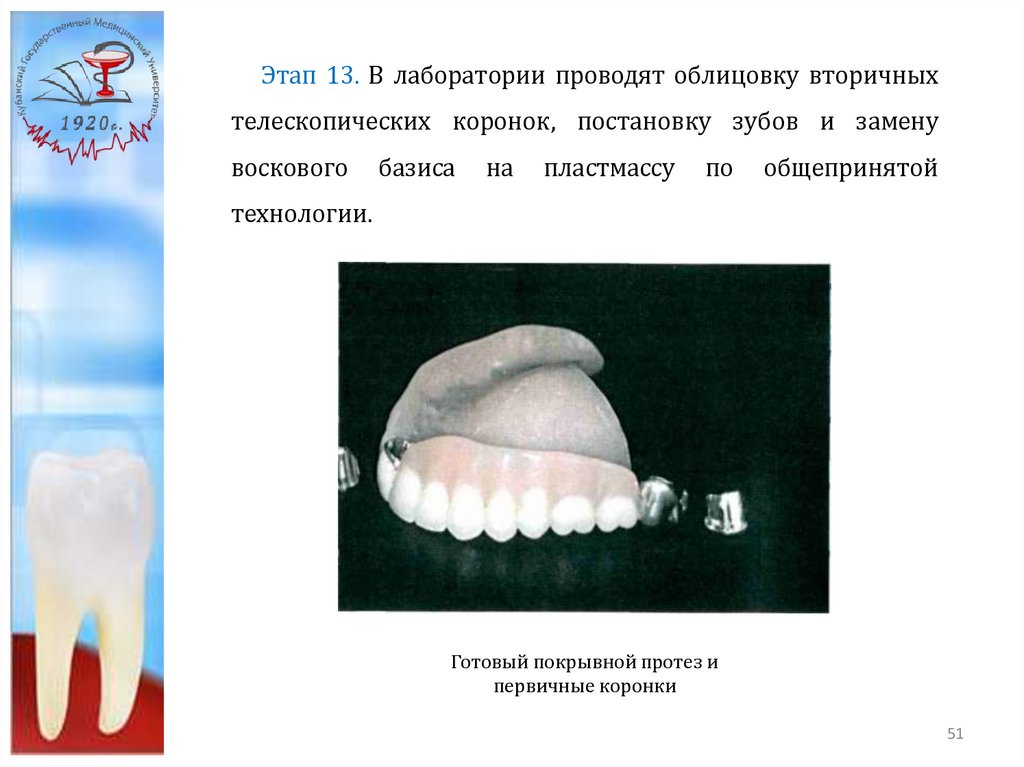 Этап 13. В лаборатории проводят облицовку вторичныхтелескопических коронок, постановку зубов и замену
