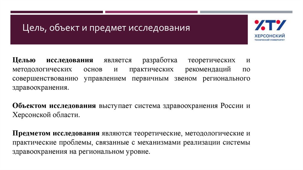 Цель, объект и предмет исследованияЦелью исследования является разработка теоретических и