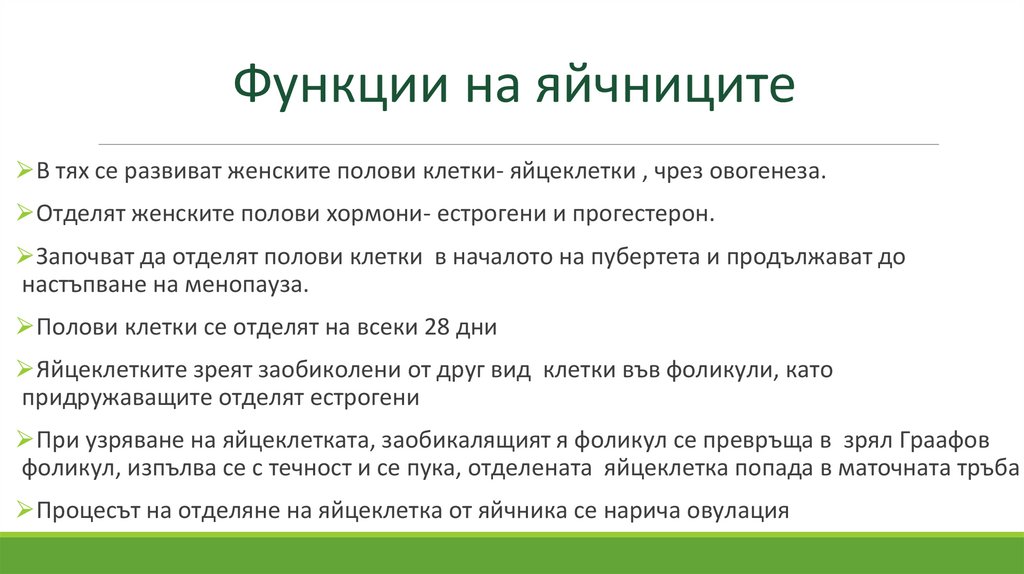 Функции на яйчниците⮚В тях се развиват женските полови клетки- яйцеклетки , чрез овогенеза.
