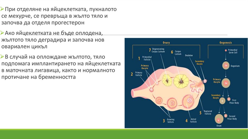 ⮚При отделяне на яйцеклетката, пукналотосе мехурче, се превръща в жълто тяло и