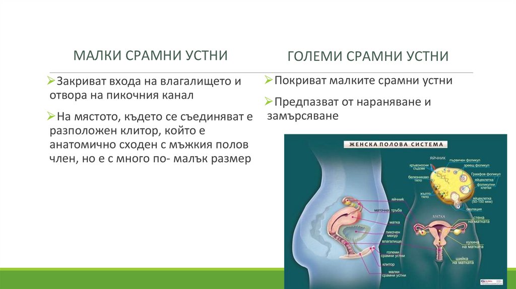 срамни устни и клитор при жените) и