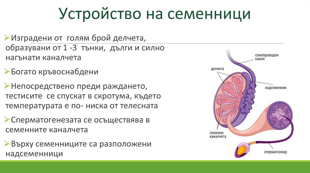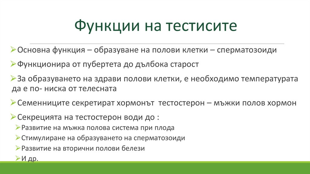 Функции на тестисите⮚Основна функция – образуване на полови клетки – сперматозоиди