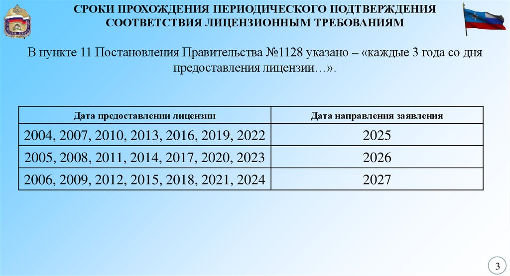 СРОКИ ПРОХОЖДЕНИЯ ПЕРИОДИЧЕСКОГО ПОДТВЕРЖДЕНИЯСООТВЕТСТВИЯ ЛИЦЕНЗИОННЫМ ТРЕБОВАНИЯМ