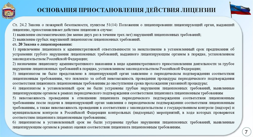 ОСНОВАНИЯ ПРИОСТАНОВЛЕНИЯ ДЕЙСТВИЯ ЛИЦЕНЗИИСт. 24.2 Закона о пожарной безопасности, пунктом 51(14) Положения о лицензировании лицензирующий орган, выдавший