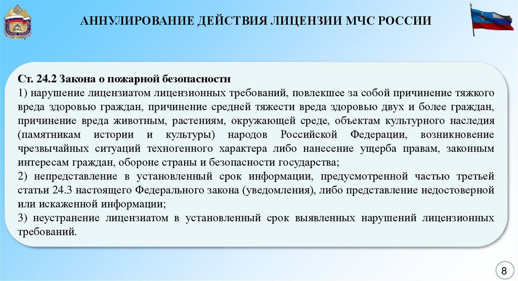 АННУЛИРОВАНИЕ ДЕЙСТВИЯ ЛИЦЕНЗИИ МЧС РОССИИСт. 24.2 Закона о пожарной безопасности