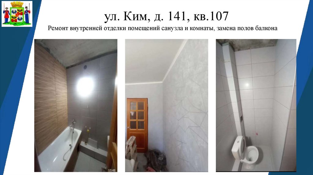 ул. Ким, д. 141, кв.107Ремонт внутренней отделки помещений санузла и комнаты, замена полов балкона