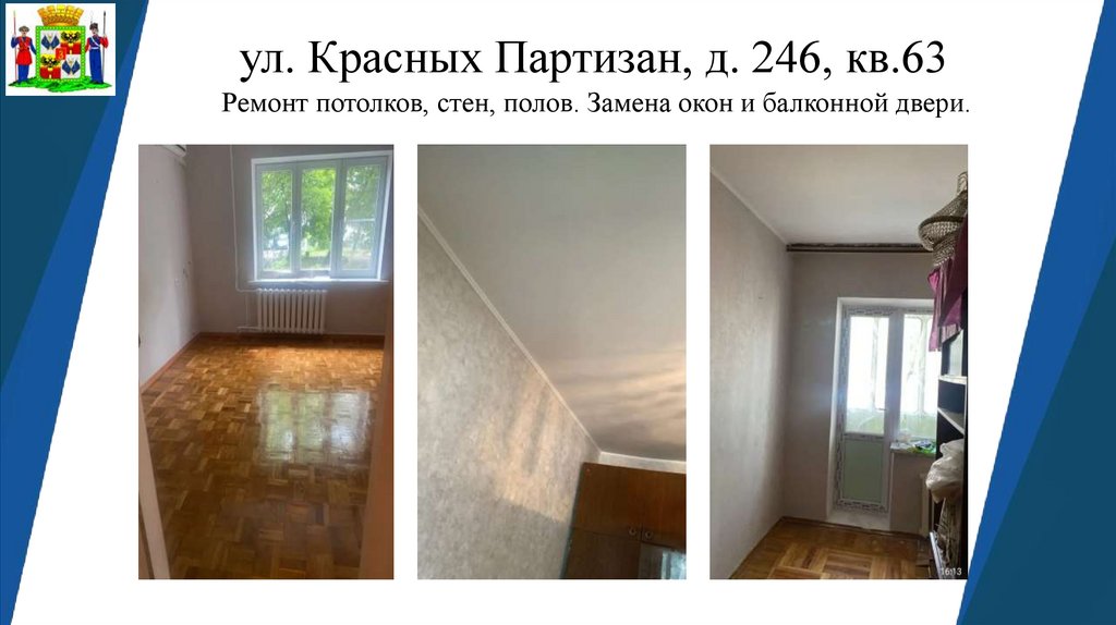 ул. Красных Партизан, д. 246, кв.63Ремонт потолков, стен, полов. Замена окон и балконной двери.
