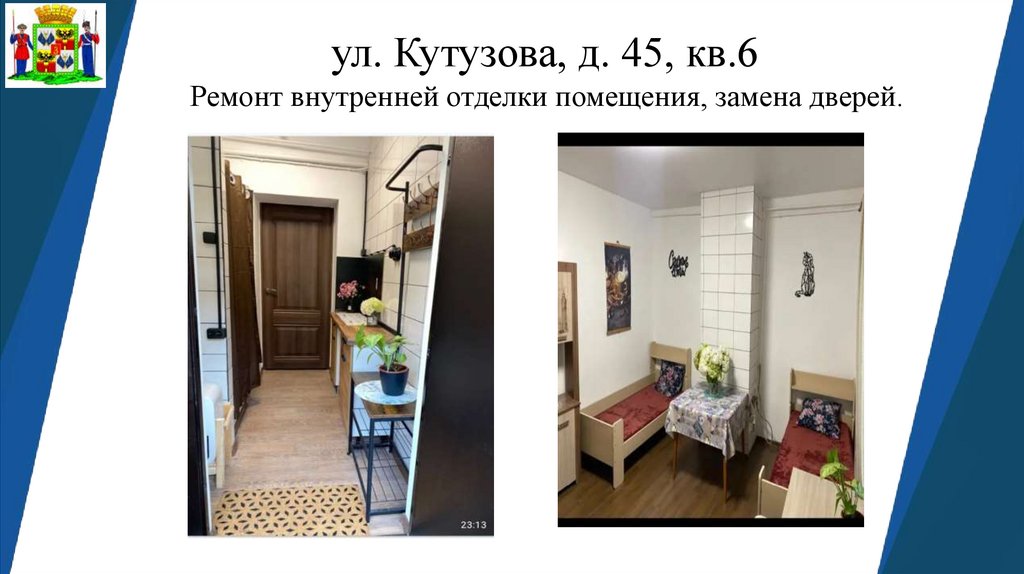 ул. Кутузова, д. 45, кв.6Ремонт внутренней отделки помещения, замена дверей.