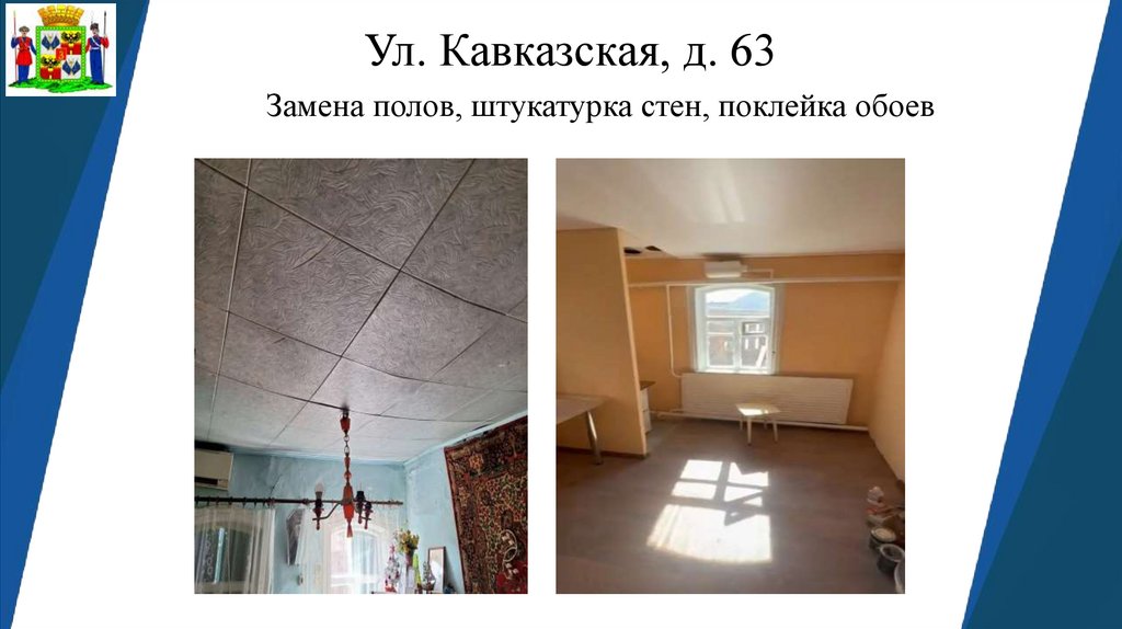 Ул. Кавказская, д. 63Замена полов, штукатурка стен, поклейка обоев