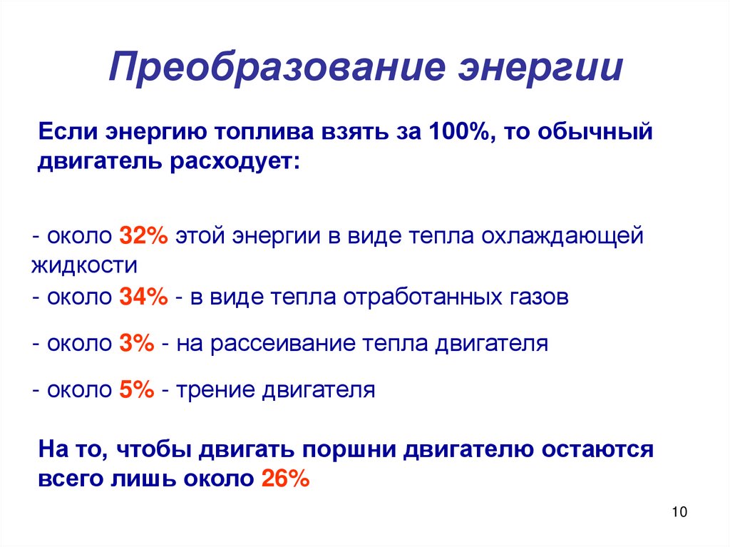 Преобразование энергииЕсли энергию топлива взять за 100%, то обычный
