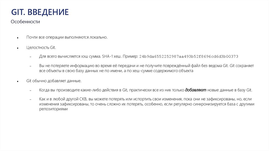 Когда вы производите какие-либо действия в Git, практически все из них только добавляют новые данные в базу Git.