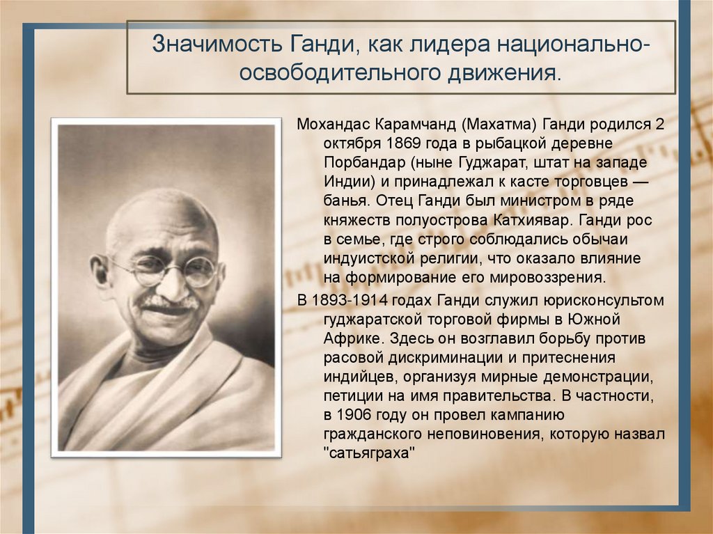 С целью уточнения значимости деятельностиГанди в качестве политика и национального