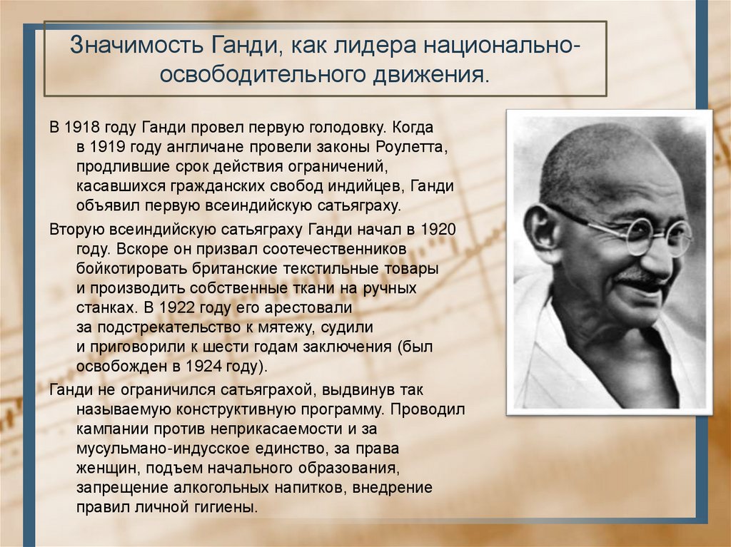 Значимость Ганди, как лидера национальноосвободительного движения.В 1918 году Ганди провел первую голодовку. Когда