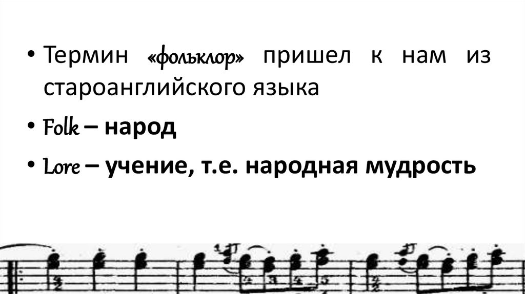 • Термин «фольклор» пришел к нам изстароанглийского языка