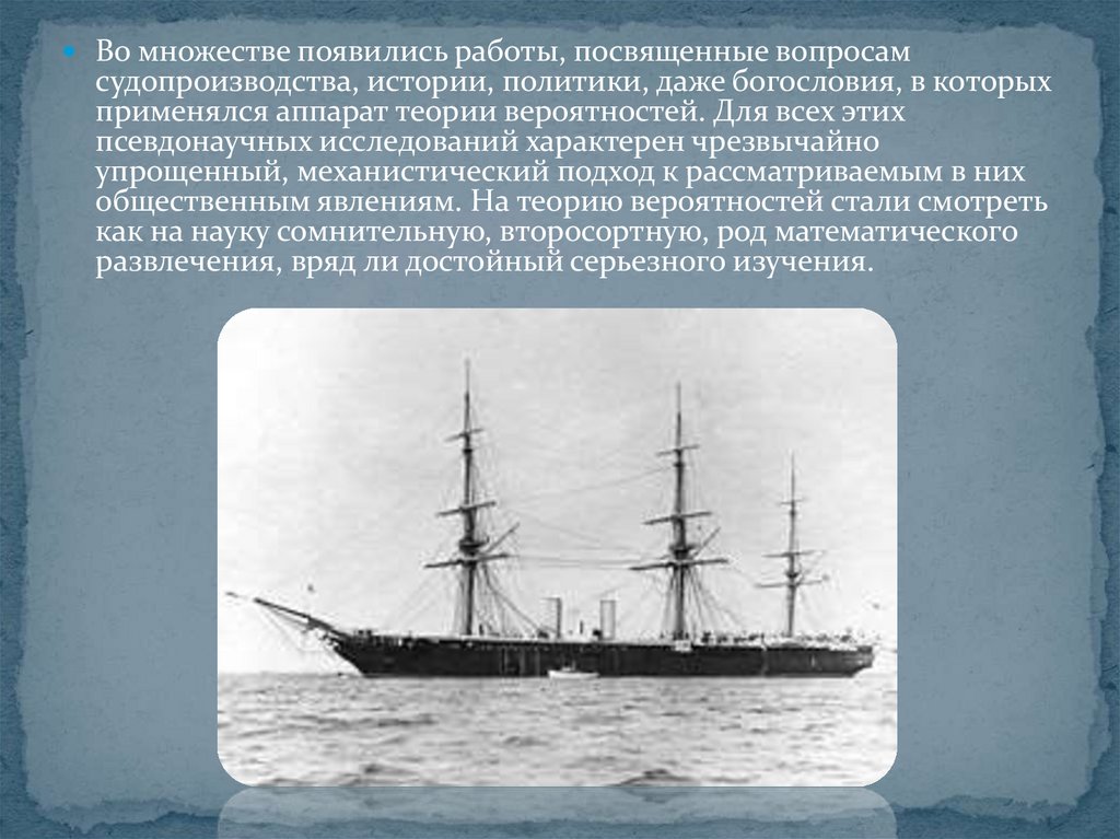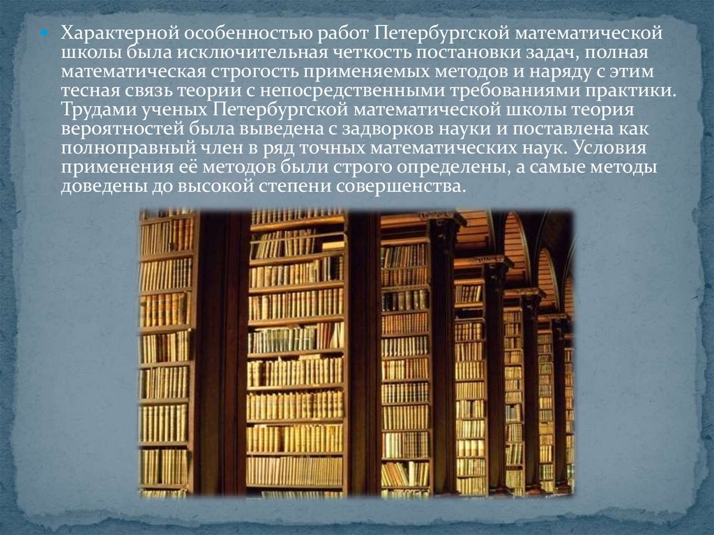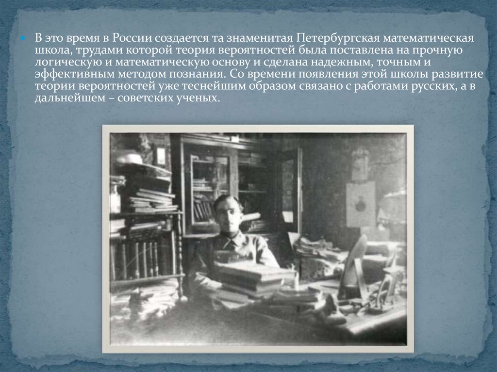 В это время в России создается та знаменитая Петербургская математическаяшкола, трудами которой теория вероятностей была поставлена на прочную