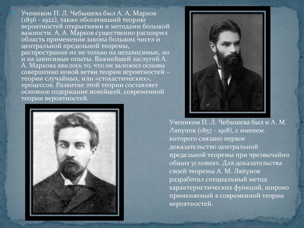 Учеником П. Л. Чебышева был А. А. Марков(1856 - 1922), также обогативший теорию