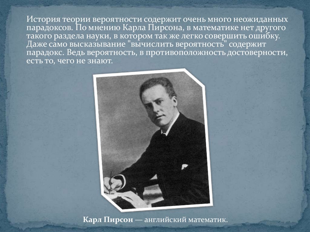 История теории вероятности содержит очень много неожиданныхпарадоксов. По мнению Карла Пирсона, в математике нет другого