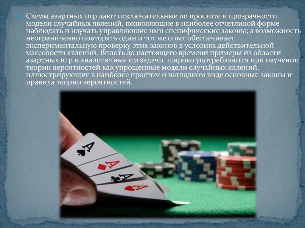 Схемы азартных игр дают исключительные по простоте и прозрачностимодели случайных явлений, позволяющие в наиболее отчетливой форме