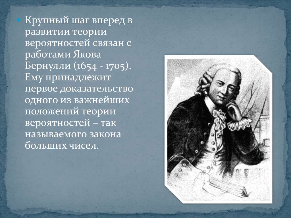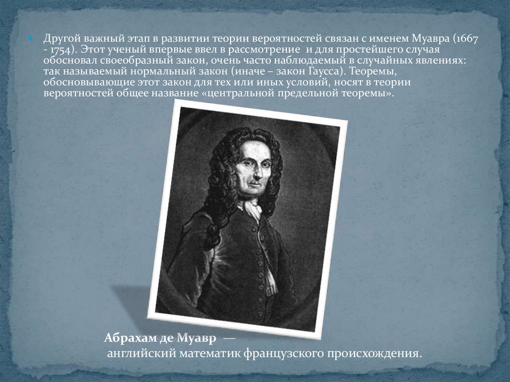 Другой важный этап в развитии теории вероятностей связан с именем Муавра (1667- 1754). Этот ученый впервые ввел в рассмотрение и для простейшего случая