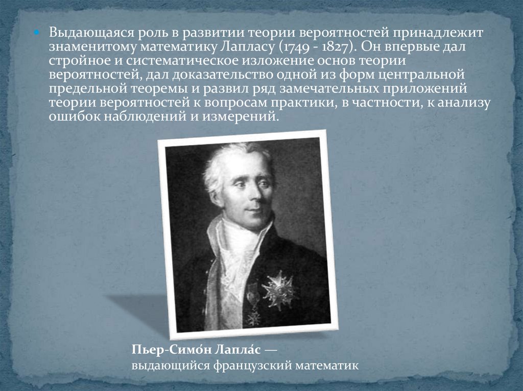 Выдающаяся роль в развитии теории вероятностей принадлежитзнаменитому математику Лапласу (1749 - 1827). Он впервые дал